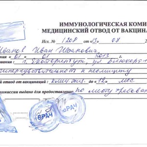 Желающий отсрочить прививки больше, чем справок, которые могут выдать врачи, учитывая планы вакцинации населения от министерства. Поэтому справка медотвод от прививок превратилась в востребованный товар, который можно приобрести в специализированных организациях. Сейчас справку с подлинным бланком и внесением в специализированный реестр можно получить за демократичную сумму без посещения больниц и контактов с врачами.