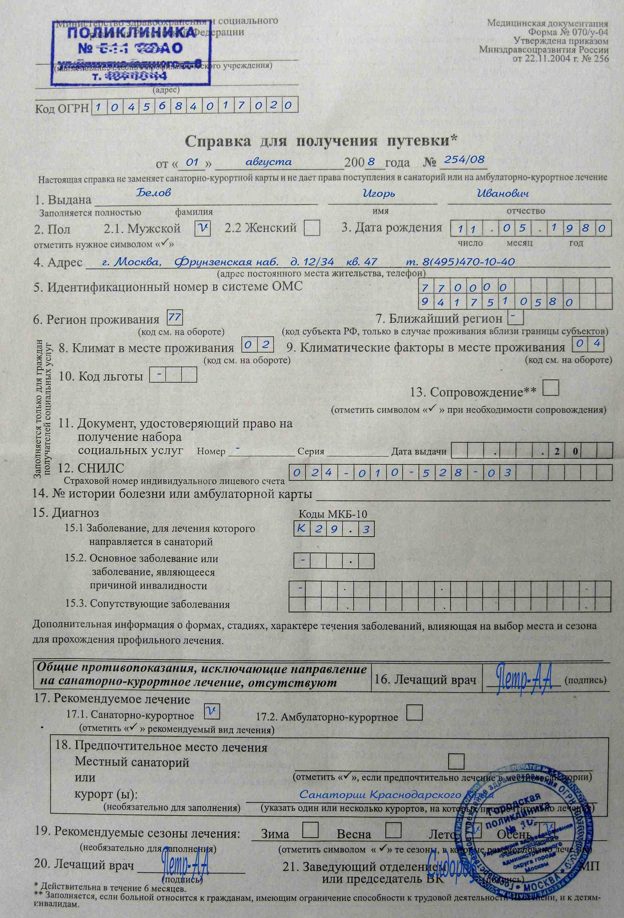 Справка 070 у для получения путевки — официальный документ, где содержится подтвержденная информация о том, что конкретный гражданин имеет определенные заболевания и нуждается в профилактическом санаторном лечении. Справка 070 у для санатория хоть и является важным документом, однако не может заменить собой санаторно-курортную карту, а также не дает гарантий поступления в оздоровительное учреждение на санаторно-курортное лечение, справка 070 у носит лишь информационный характер.