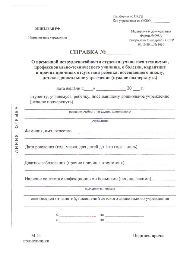 - Студенческая справка 095 является оправданием для прогула. Таким образом можно закрыть отсутствие в учебном заведении сроком до 14 дней. Все объясняется тем, что заболевшему человеку необходимо время, чтобы поправить здоровье, а также не заражать остальных участников процесса обучения.