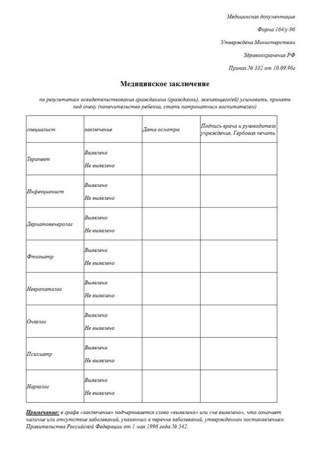 Человек, которого интересует медицинская справка 164 у, и при этом имеет желание оформить опеку над ребенком, в любом случае должен иметь хорошее состояние здоровья, о чем гласит требование Министерства Здравоохранения РФ. Государством также был установлен заболеваний, при котором человек не сможет получить такой документ как медицинская справка форма 164: