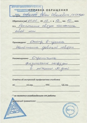 Чтобы получить необходимый документ, следует сразу после случившегося инцидента отправиться в ближайший травмпункт и зафиксировать вред, причиненный здоровью. Чтобы узнать адреса ближайших травмпунктом, можно обратиться в справочную либо посмотреть в интернете. После этого врач-травмотолог проведет осмотр и напишет заключение. Останется только поставить печать на выходе и отнести документ по месту требования: на работу или учебу.
