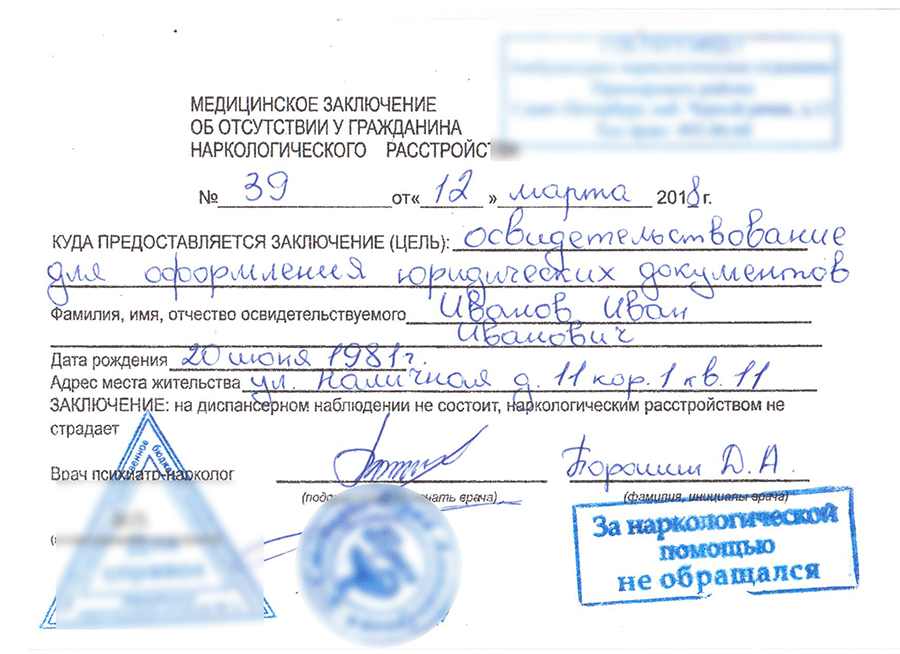 Если вы не употребляли никогда запрещенные вещества и не хотите тратить время на очереди при посещении медицинских учреждений, то мы предлагаем компромиссное решение проблемы. На нашем сайте за 15 минут можно заказать нужную вам справку. Для этого необходимо лишь заполнить на нем анкету либо по указанному телефону связаться с нашими специалистами и сообщить о проблеме. Также нужно сообщить фактический адрес, и на следующий день по нему будет доставлен документ. Вся процедура получения справки займет всего одни сутки.